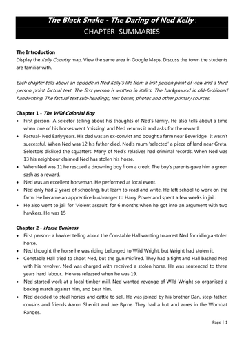 Chapter Summaries Of Carole Wilkinson S Book Black Snake The Daring Of Ned Kelly Teaching Resources